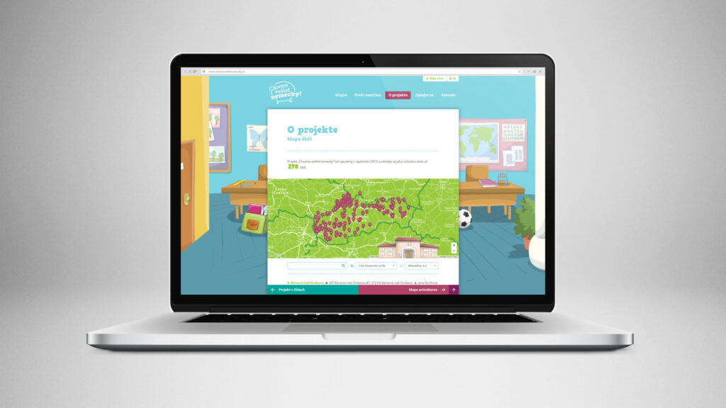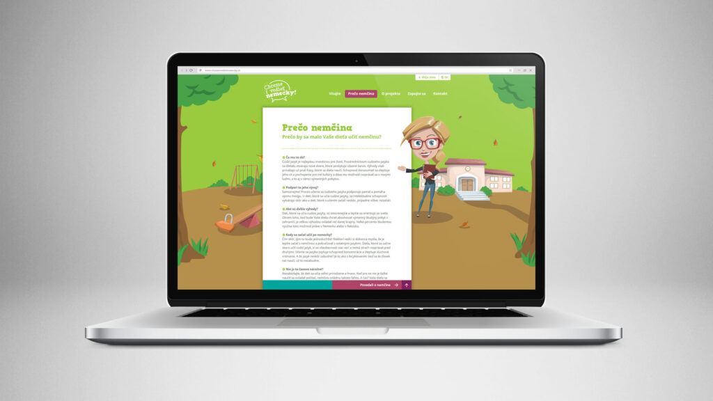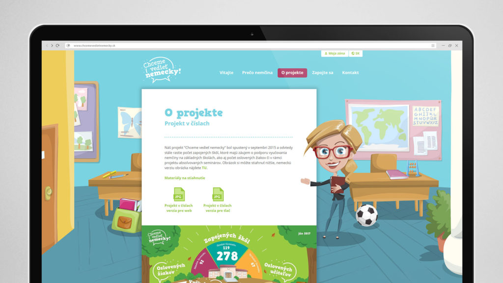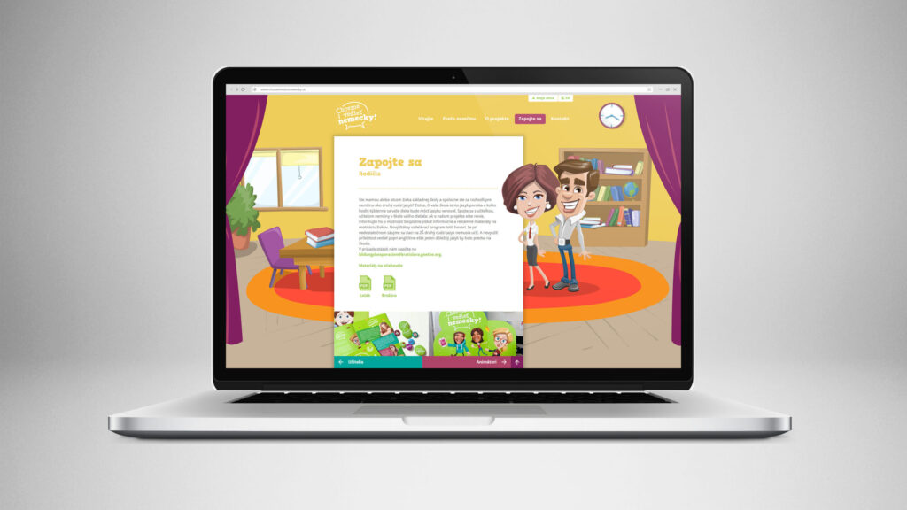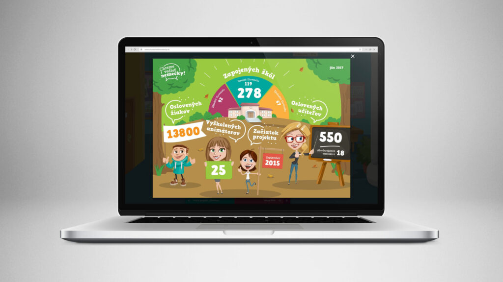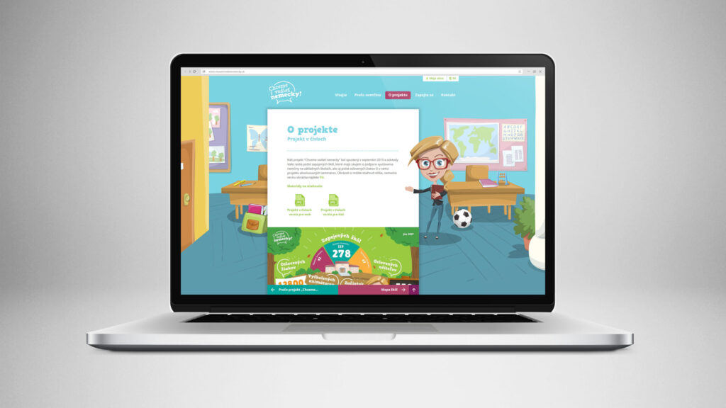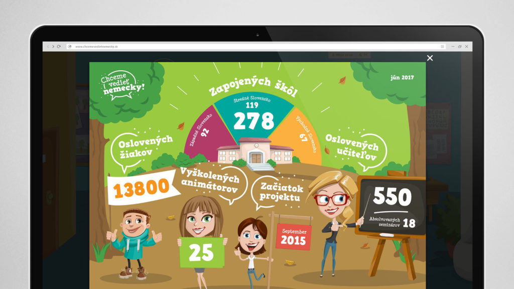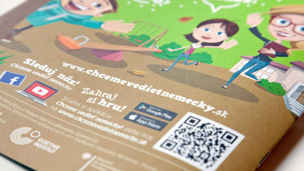Projektu sme navrhli jednoduchý a hravý vizuálny štýl, farebne nadväzujúci na identitu Goetheho Inštitútu, ktorý projekt realizuje. V priebehu projektu vznikli nápady a požiadavky na viacero nástrojov, ktorými boli vždy od začiatku školského roka oslovovaní žiaci, ich rodičia, aj samotné školy a učitelia nemčiny. Po troch rokoch fungovania je v projekte zapojených takmer 300 škôl z celého Slovenska, pre ktoré sme navrhli plagáty, letáky, foto-stenu – peepboard, časopis s vyplňovačkami a hravú mobilnú aplikáciu. Pre animátorov sme k animačným hodinám navrhli tzv. animačný kufor s hrami, pomôckami a darčekovými predmetmi. Pre sociálne siete projektu sme v spolupráci so Stalker Production navrhli a pripravili krátke virálne videá „Nemčina s Čekym“ s hercom Mariánom Čekovským.