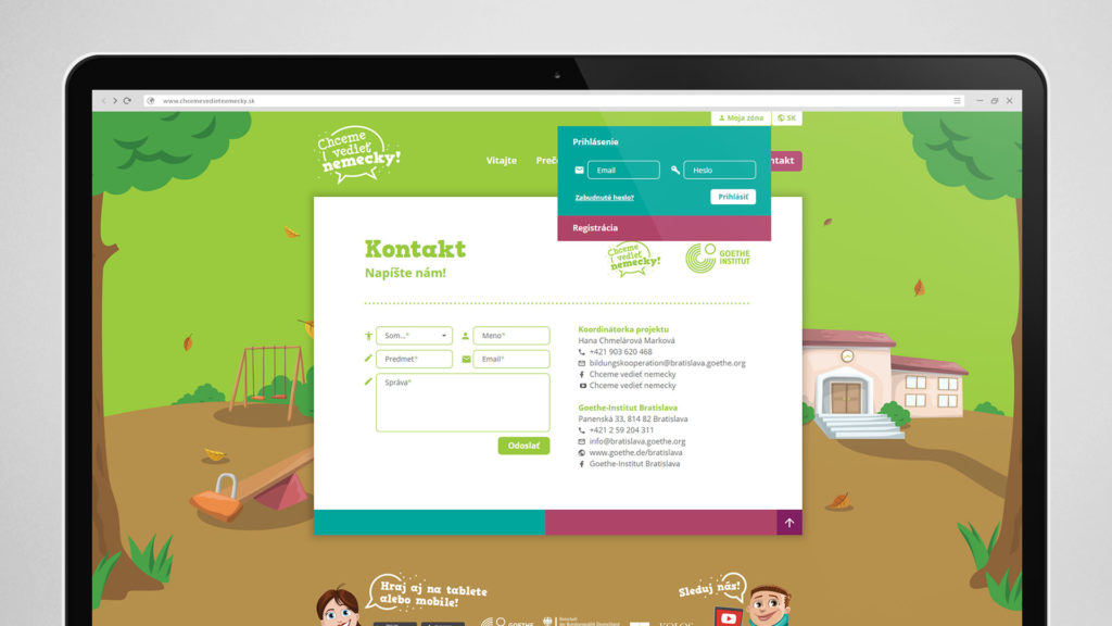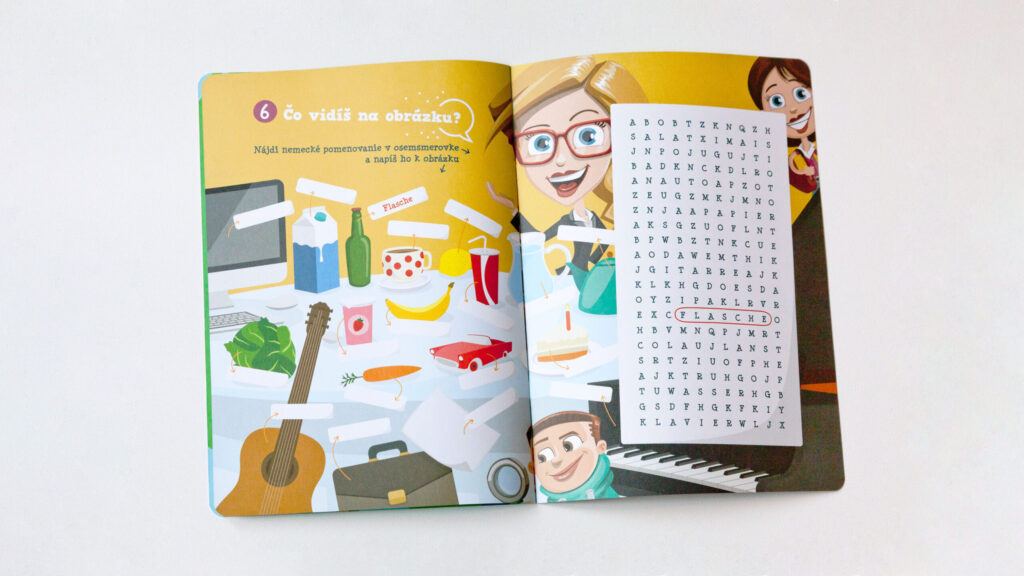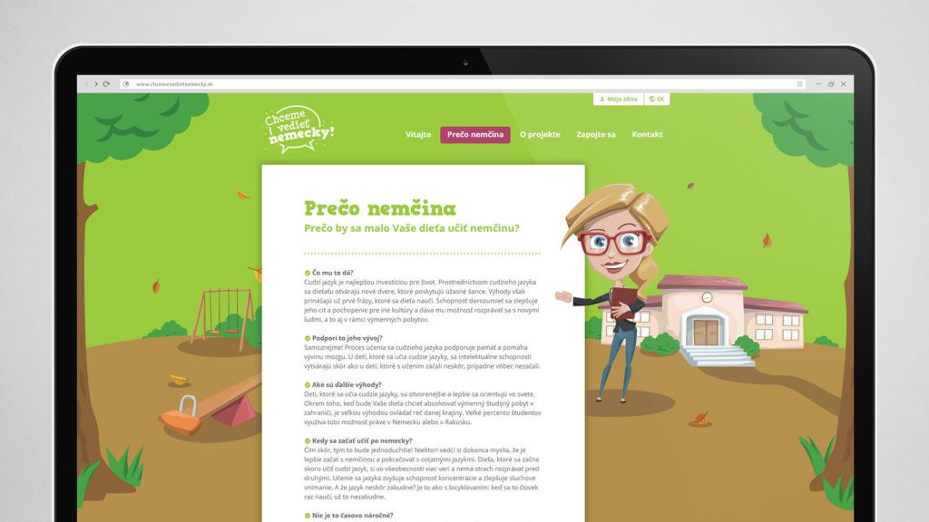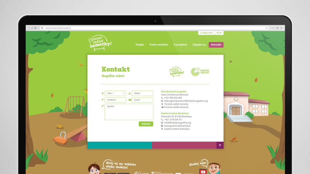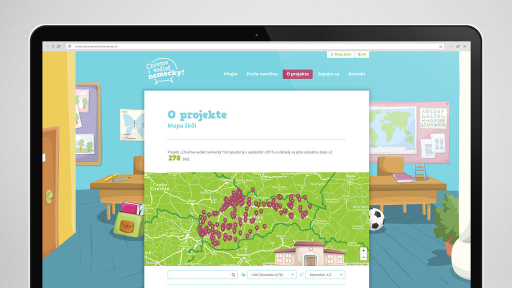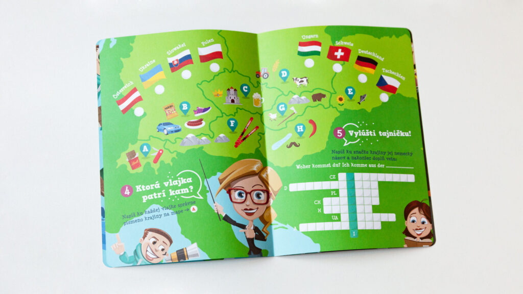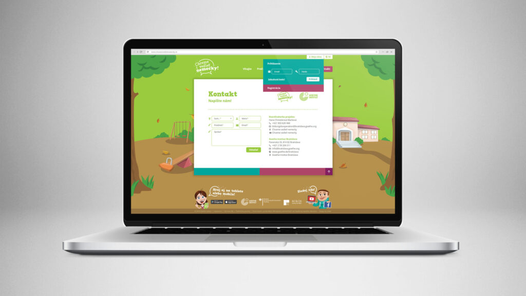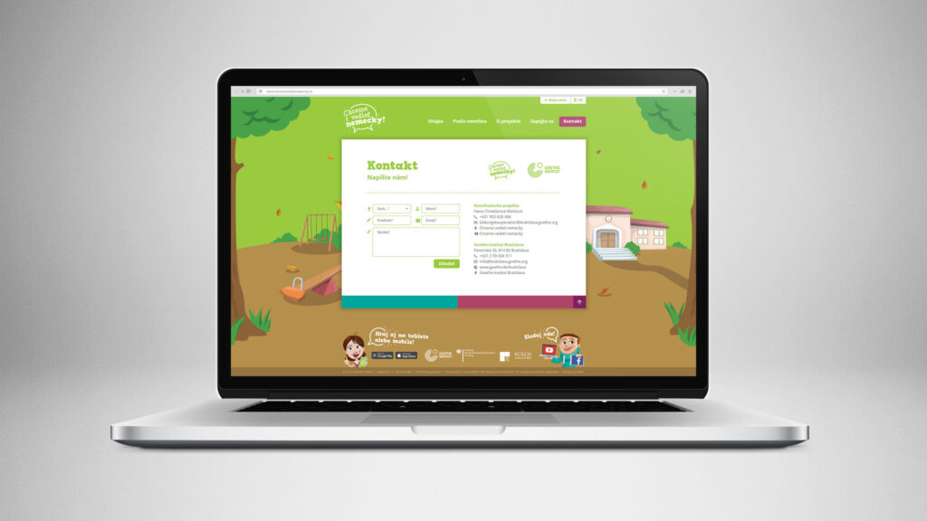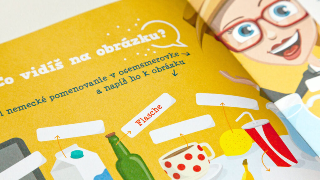 Projektu sme navrhli jednoduchý a hravý vizuálny štýl, farebne nadväzujúci na identitu Goetheho Inštitútu, ktorý projekt realizuje. V priebehu projektu vznikli nápady a požiadavky na viacero nástrojov, ktorými boli vždy od začiatku školského roka oslovovaní žiaci, ich rodičia, aj samotné školy a učitelia nemčiny. Po troch rokoch fungovania je v projekte zapojených takmer 300 škôl z celého Slovenska, pre ktoré sme navrhli plagáty, letáky, foto-stenu – peepboard, časopis s vyplňovačkami a hravú mobilnú aplikáciu. Pre animátorov sme k animačným hodinám navrhli tzv. animačný kufor s hrami, pomôckami a darčekovými predmetmi. Pre sociálne siete projektu sme v spolupráci so Stalker Production navrhli a pripravili krátke virálne videá „Nemčina s Čekym“ s hercom Mariánom Čekovským.